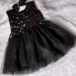kids blue sequence and yellow color net knee length sleeveless frock with matching hairband.