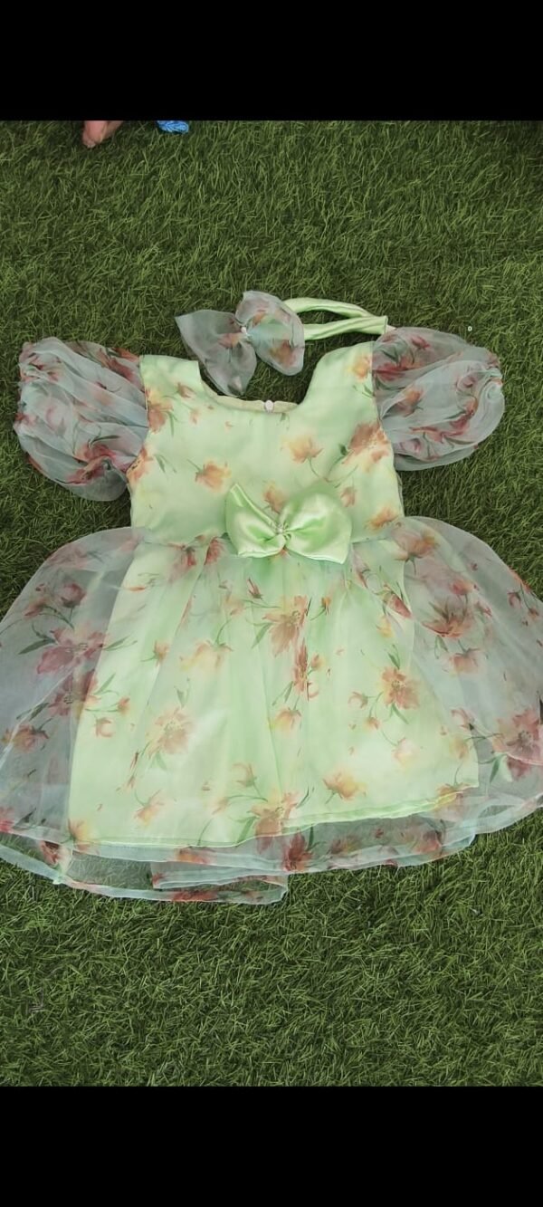- Green colour color organza Party wear puff sleeve design Frock for Girls