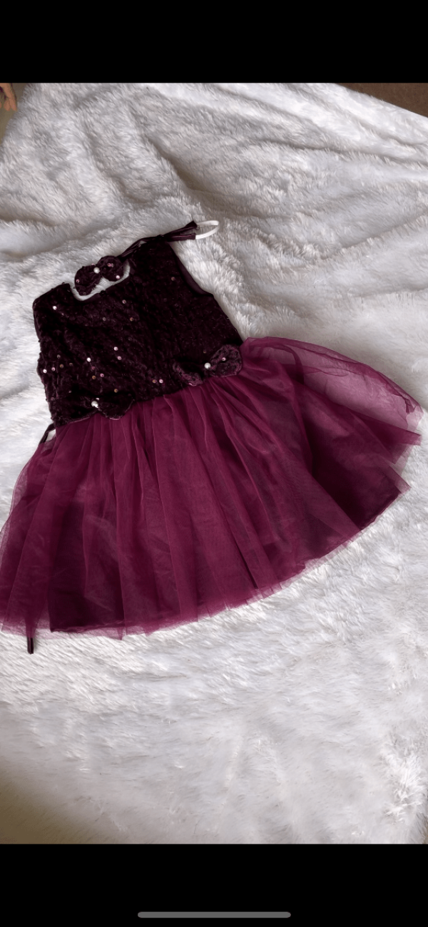kids wine sequence and net knee length sleeveless frock with matching hairband.