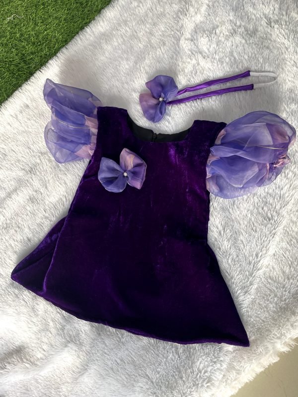 - Purple Colour Velvet Frock with Organza Sleeves for Girls