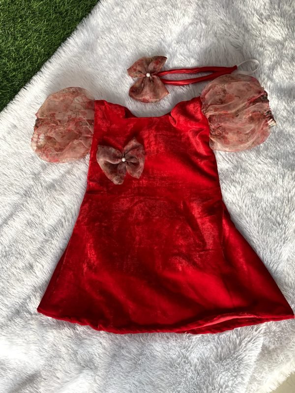 - Red Colour Velvet Frock with Organza Sleeves for Girls
